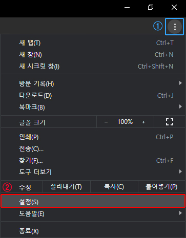 1. 크롬 화면 우측 상단의 'Chrome 맞춤 설정 및 제어' 아이콘을 누른다.